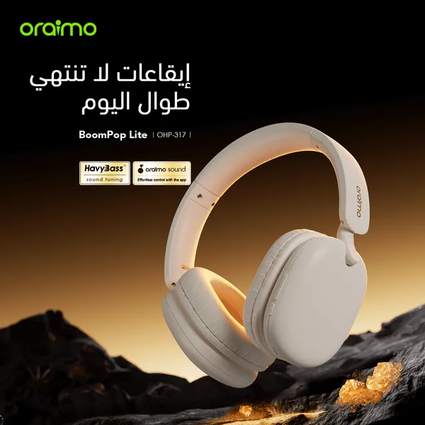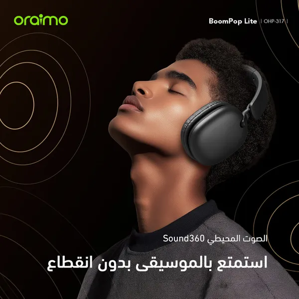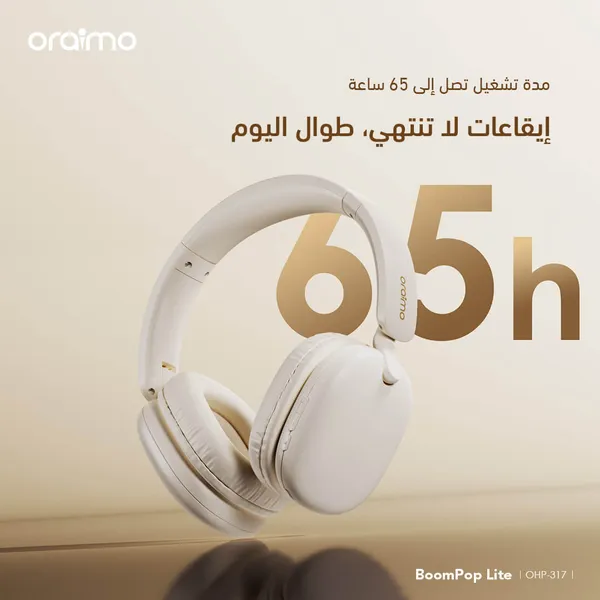 Oraimo BoomPop Lite OHP-317، ركّز على الكلمات المفتاحية القوية مثل “سماعات اورايمو”، “هيدفون بلوتوث”، “عزل الضوضاء ENC”، “صوت محيطي Sound360″، “بطارية 65 ساعة”، “شحن سريع . سماعة Oraimo BoomPop Lite (OHP-317): 65 ساعة من الصوت الغامر مع ENC وSound360.